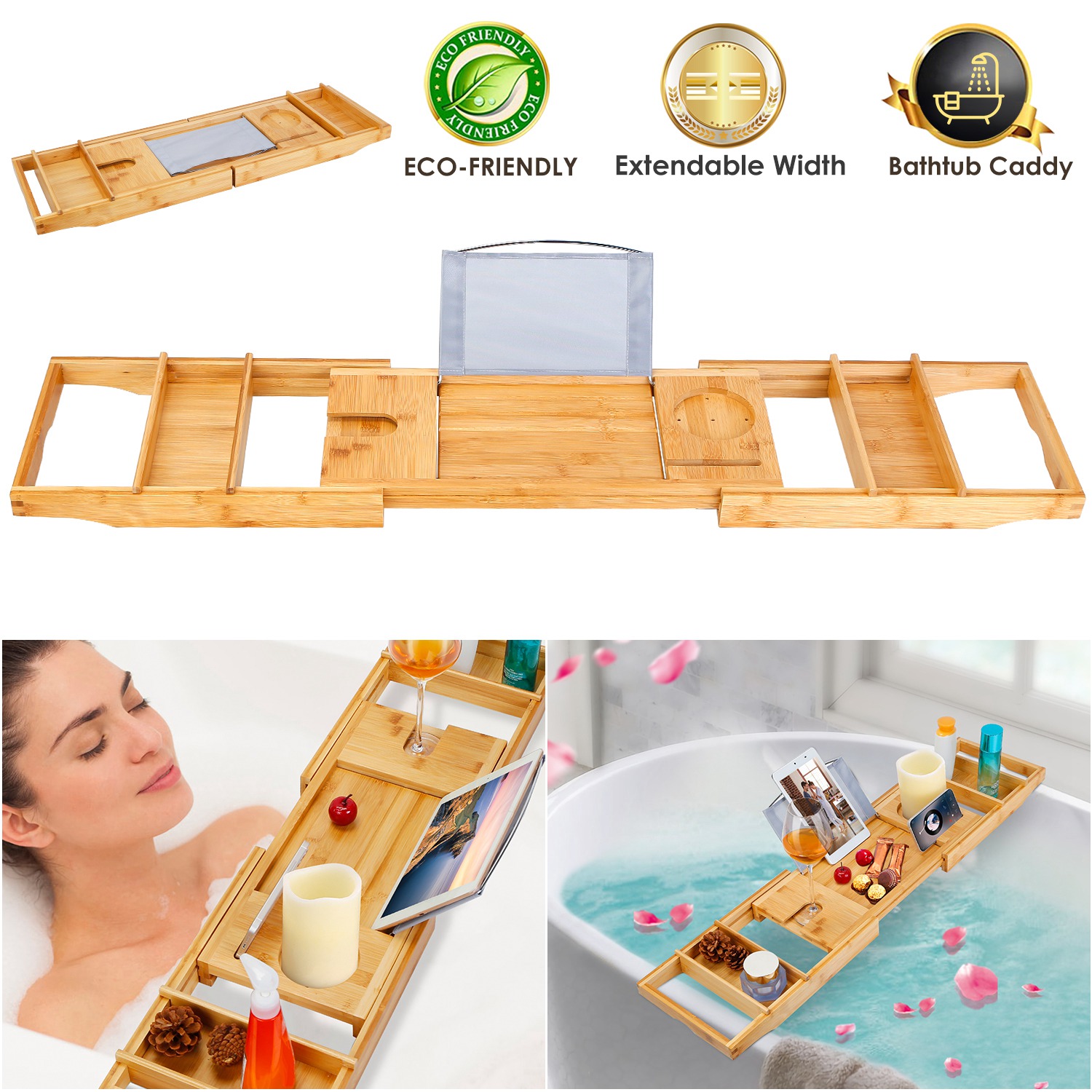 Home > Bathtub Caddy Tray Crafted Bamboo Bath Tray Table Extendable Reading Rack Tablet Phone Holder Wine Glass Holder Shelf Desk Bathroom Spa